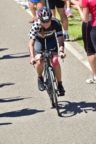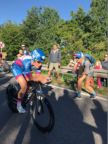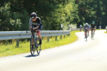 Nachdem Ecki sich seine Zielverpflegung abgeholt hatte trafen wir uns an der Radstrecke wieder. Das Profifeld nahte und wir warteten bis sie in beeindruckendem Tempo vorüber waren, bevor wir uns auf den kurzen Weg zum Bäcker in Hilpoltstein machten, um zu frühstücken. Direkt an der Radstrecke sitzend genossen wir die Atmosphäre bei einem Kaffee. Dabei verfolgten wir natürlich Steffis Zwischenzeiten und errechneten ihre erwartete Durchgangszeit bei km 85, wo wir sie nochmals anfeuern wollten. Zum Glück hatte Ecki ein gutes Gespür, denn er drängte gerade noch rechtzeitig zum Aufbruch. Steffi kam etwas früher als erwartet vorbei und sah dabei noch top fit aus als sie sich auf die zweite Runde begab. Wir machten uns hingegen mit unseren Rädern auf den Weg nach Roth.