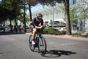Auf der Radstrecke waren vier Runden zu absolvieren. Erst leicht wellig raus aus der Stadt, dann flach auf dem Highway entlang, wobei man trotzdem immer aufmerksam sein musste, da im eigentlich sonst guten Asphalt manchmal fiese Löcher waren, und vor dem Umkehrpunkt ging es nochmal ca. einen Kilometer etwas bergauf. Oben U-Turn und alles wieder zurück.