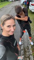 So kam ich mit einer für mich durchschnittlichen Schwimmzeit aus dem Wasser. Steffi war natürlich etwas flotter unterwegs und wir sahen uns noch kurz beim Wechsel. Auch wenn es noch stark nach Regen aussah entschieden wir uns gegen eine Weste. Die Temperaturen waren eigentlich ok.