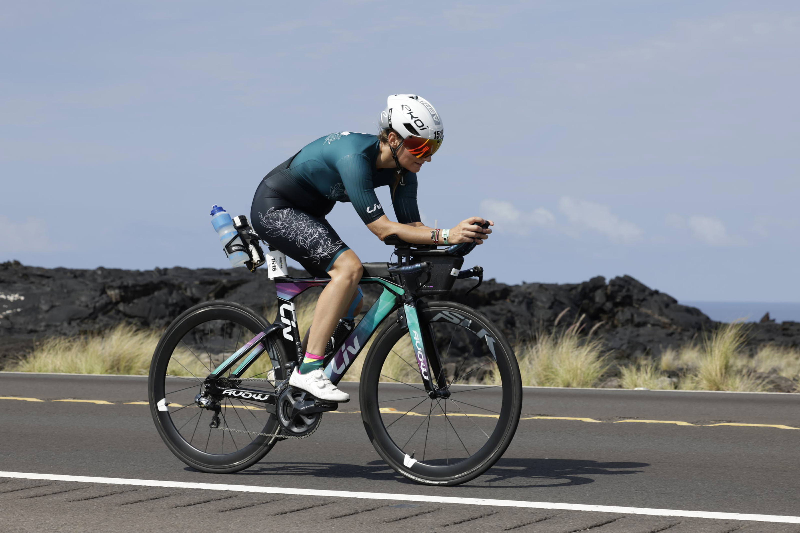 Erst ging es schnelle zehn Kilometer durch Kona, dann hinaus auf den Highway Richtung Hawi. Anfangs sogar ohne Wind und mit bedecktem Himmel. Leider kam die Sonne kurz später aber doch heraus und es brannte auf den Asphalt. Die Hauptaufgabe während des Rennens bestand aus guter Verpflegung und darin, den Körper möglichst oft herunterzukühlen. Also an jeder Verpflegungsstation, die ca alle 20 Kilometer kamen, einmal Wasser im Trinksystem nachfüllen, einmal Wasser über den Kopf, Rücken und die Beine und einen Schluck Cola. Dazu alle 20 Minuten einen großen Schluck aus der Gelflasche und alle 40 Kilometer eine Salztablette.